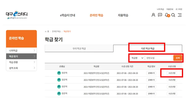 2. 온라인 학습 메뉴 아래에서 학급 찾기를 누릅니다.