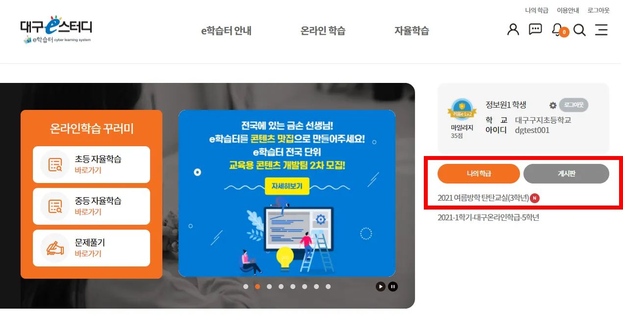 1. e학습터에 로그인하여 온라인 학습 메뉴를 누릅니다.