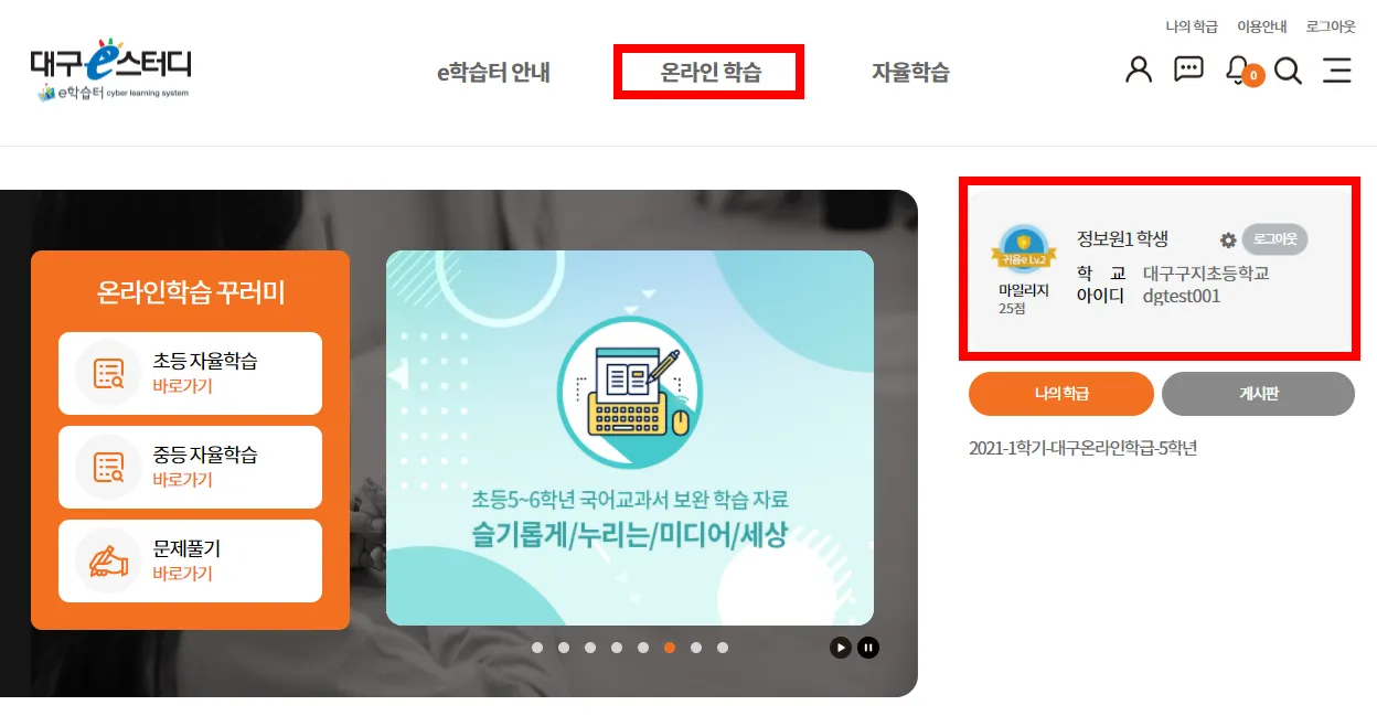 1. e학습터에 로그인하여 온라인 학습 메뉴를 누릅니다.