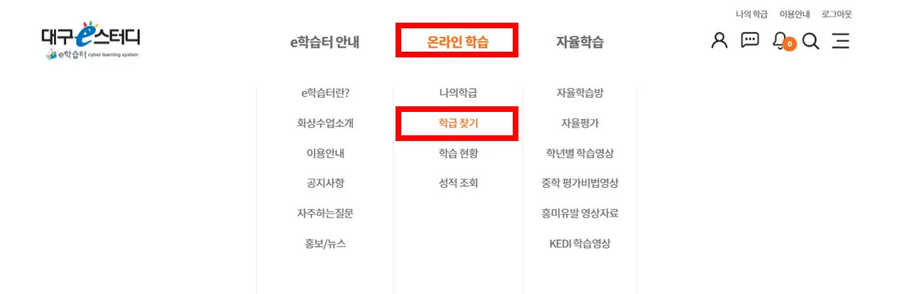 2. 온라인 학습 메뉴 아래에서 학급 찾기를 누릅니다.