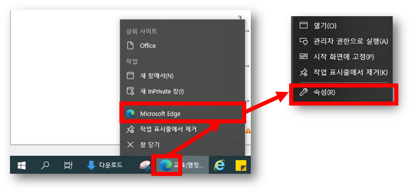1. 엣지 아이콘을 우클릭 해서 [속성] 열기