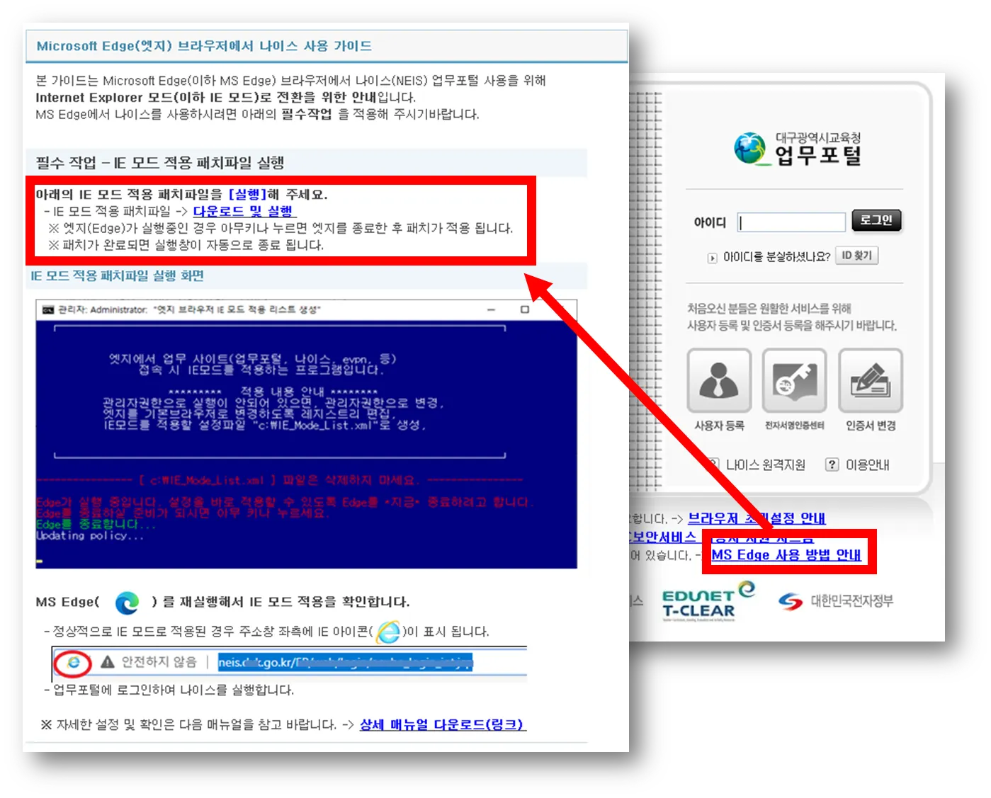 패치 파일은 [업무포털 초기화면] - 로그인 창 하단에 [MS Edge 사용 방법 안내] 링크 클릭 - 팝업창에서 IE 모드 적용 패치파일 [다운로드 및 실행] 에서 받을 수 있습니다.