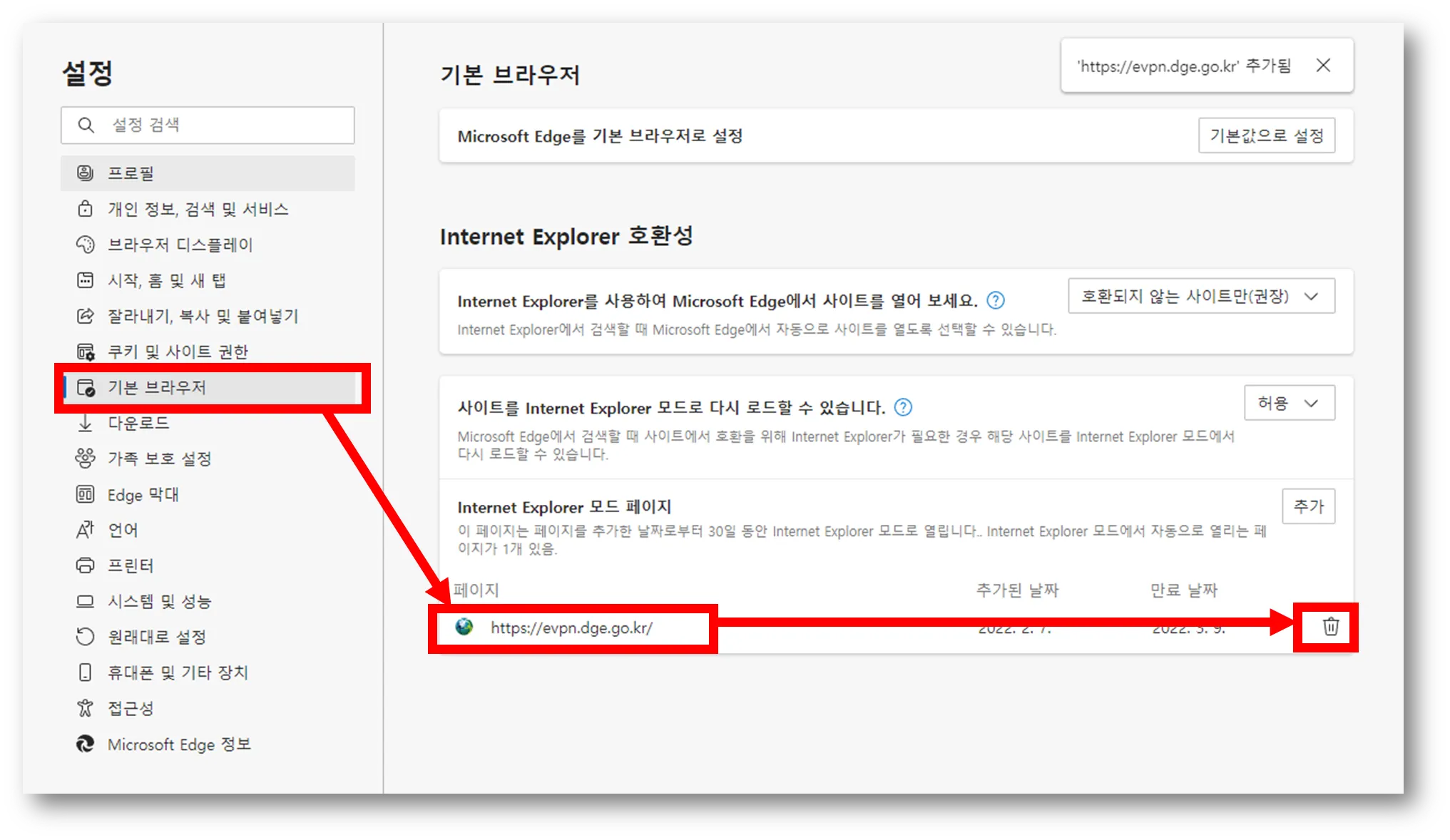 [설정] - [기본 브라우져] 에서 EVPN URL 추가된 것이 있다면 삭제하기 - 추가가 아니라 삭제입니다.