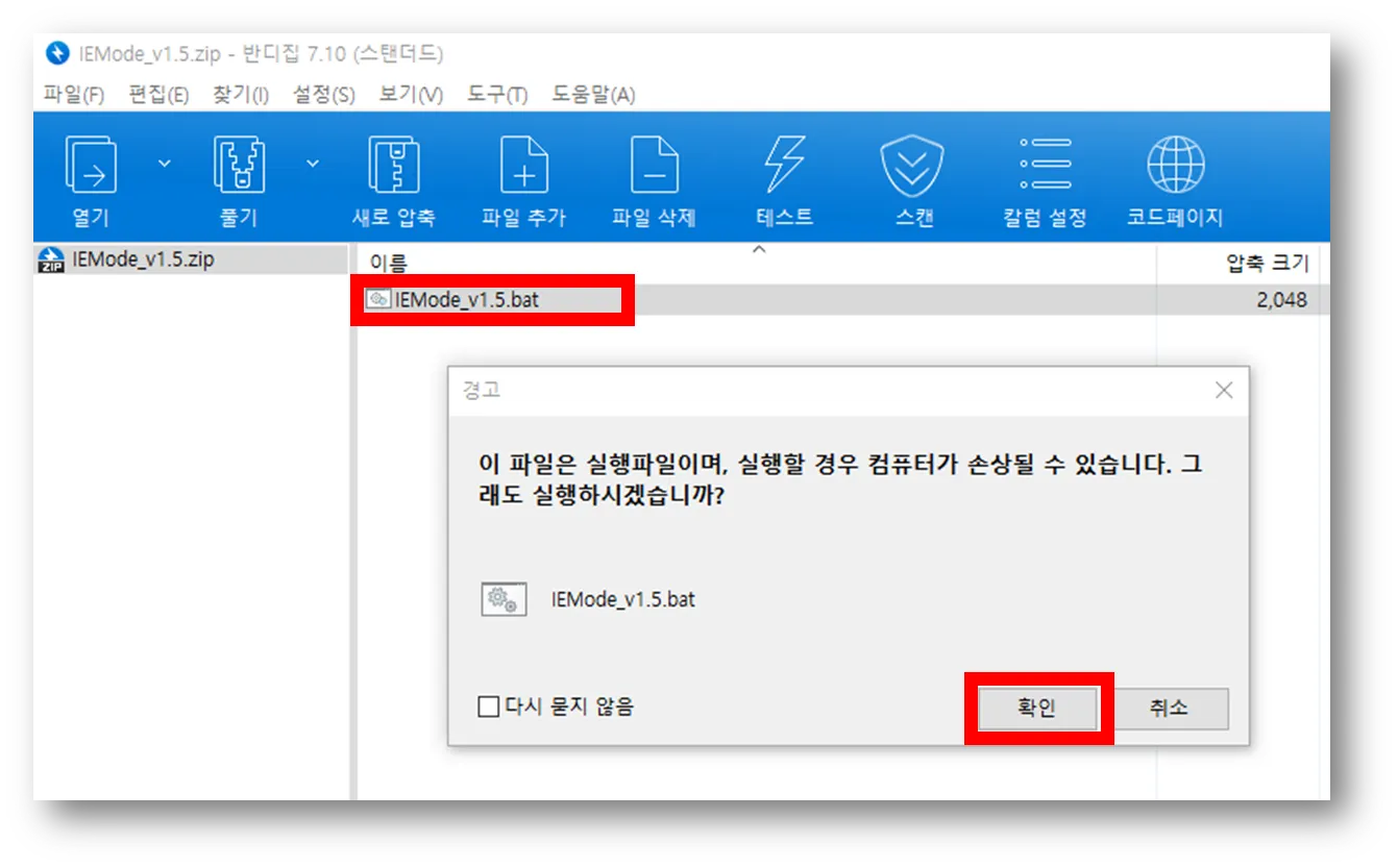 압축 파일 안에 있는 IEMode_v1.5.bat 를 실행합니다. 아래와 같은 경고창이 뜨는데 무시하고 진행(확인)하시면 됩니다. 다른 경고창이 추가로 나와도 진행하시면 됩니다.