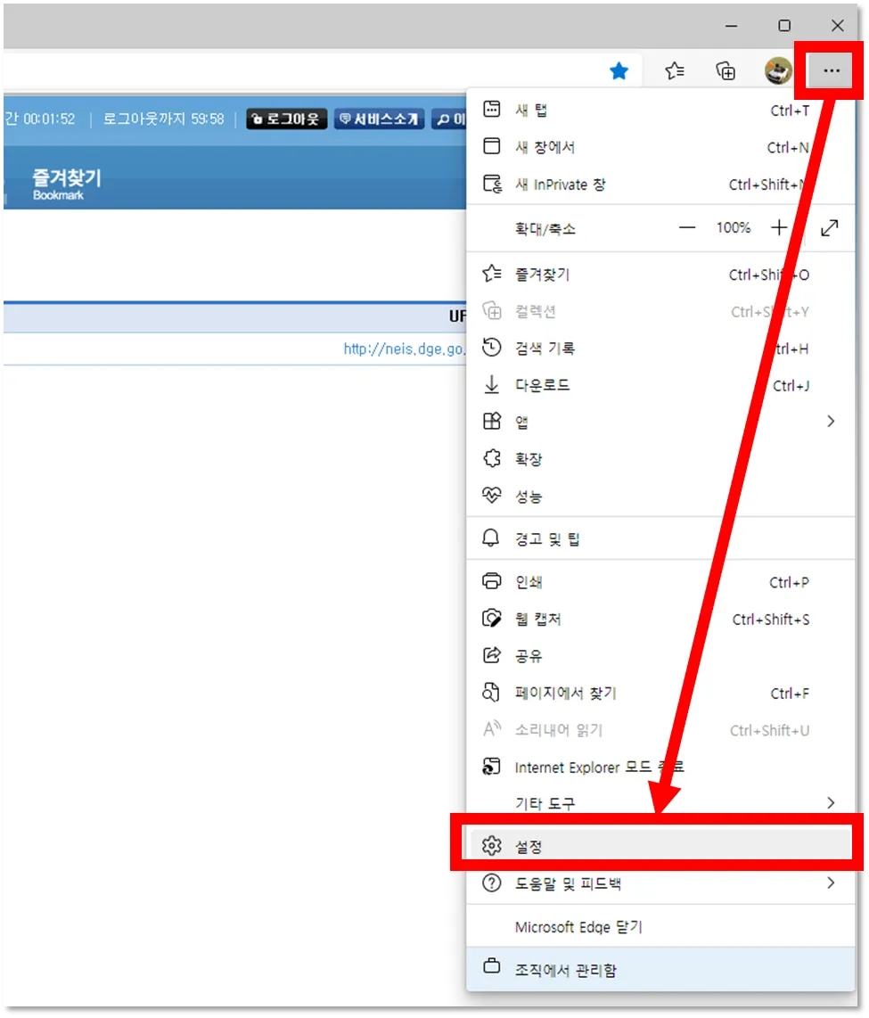 Edge 우측 상단에 [...] 버튼 클릭 - [설정] 열기