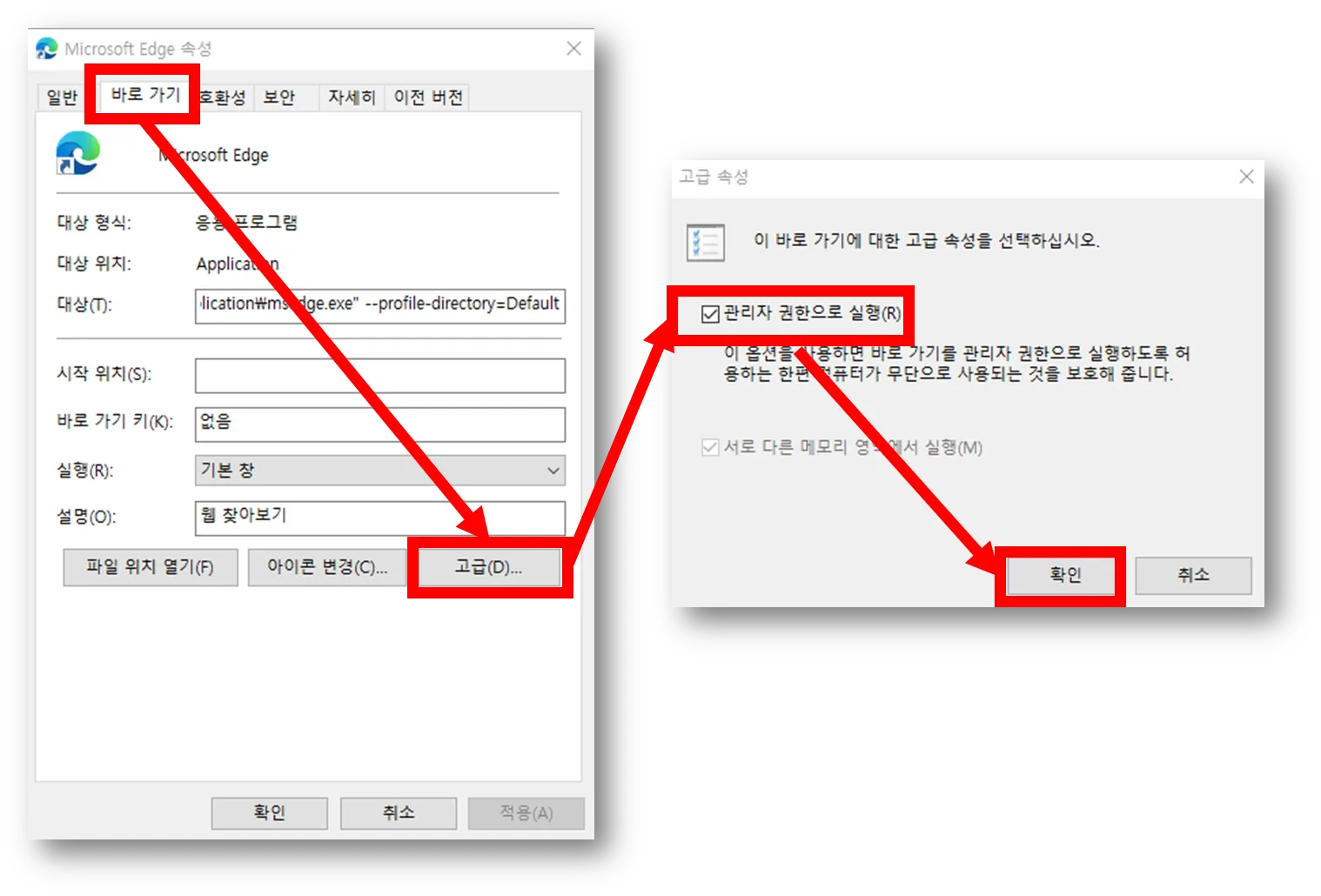 [바로 가기] - [고급] - [관리자 권한으로 실행] 체크 - [확인]